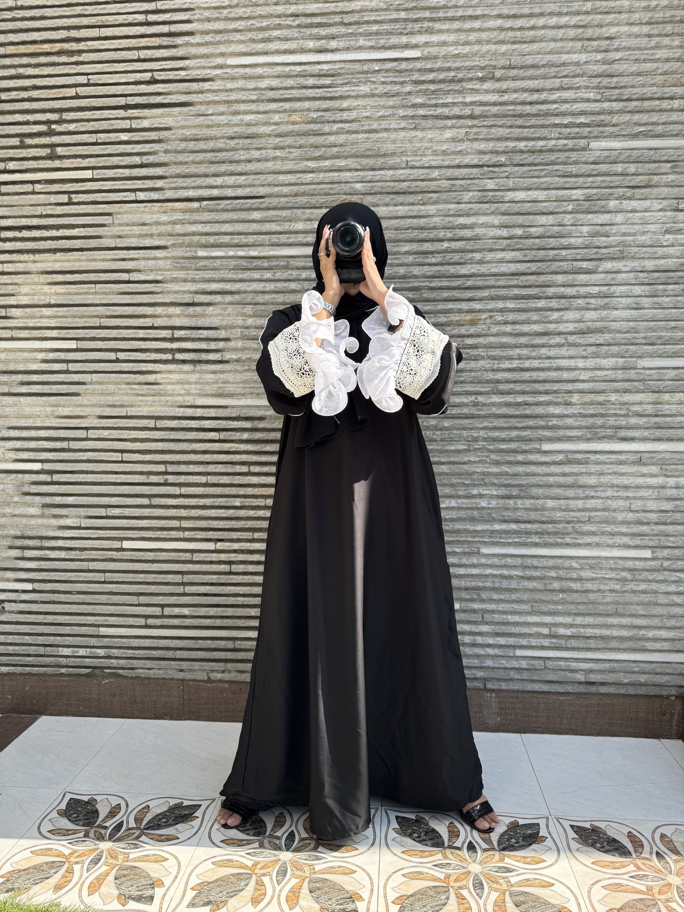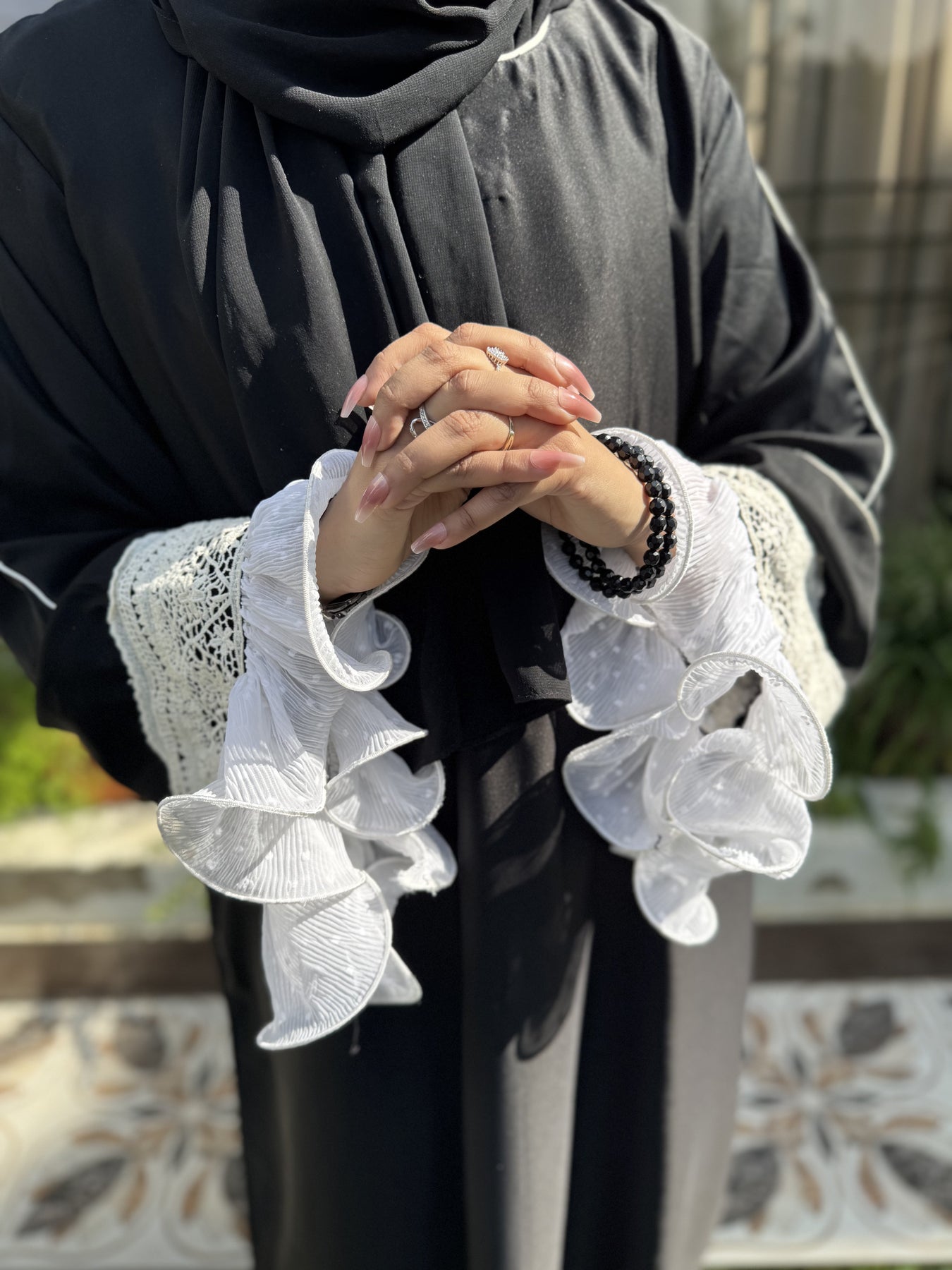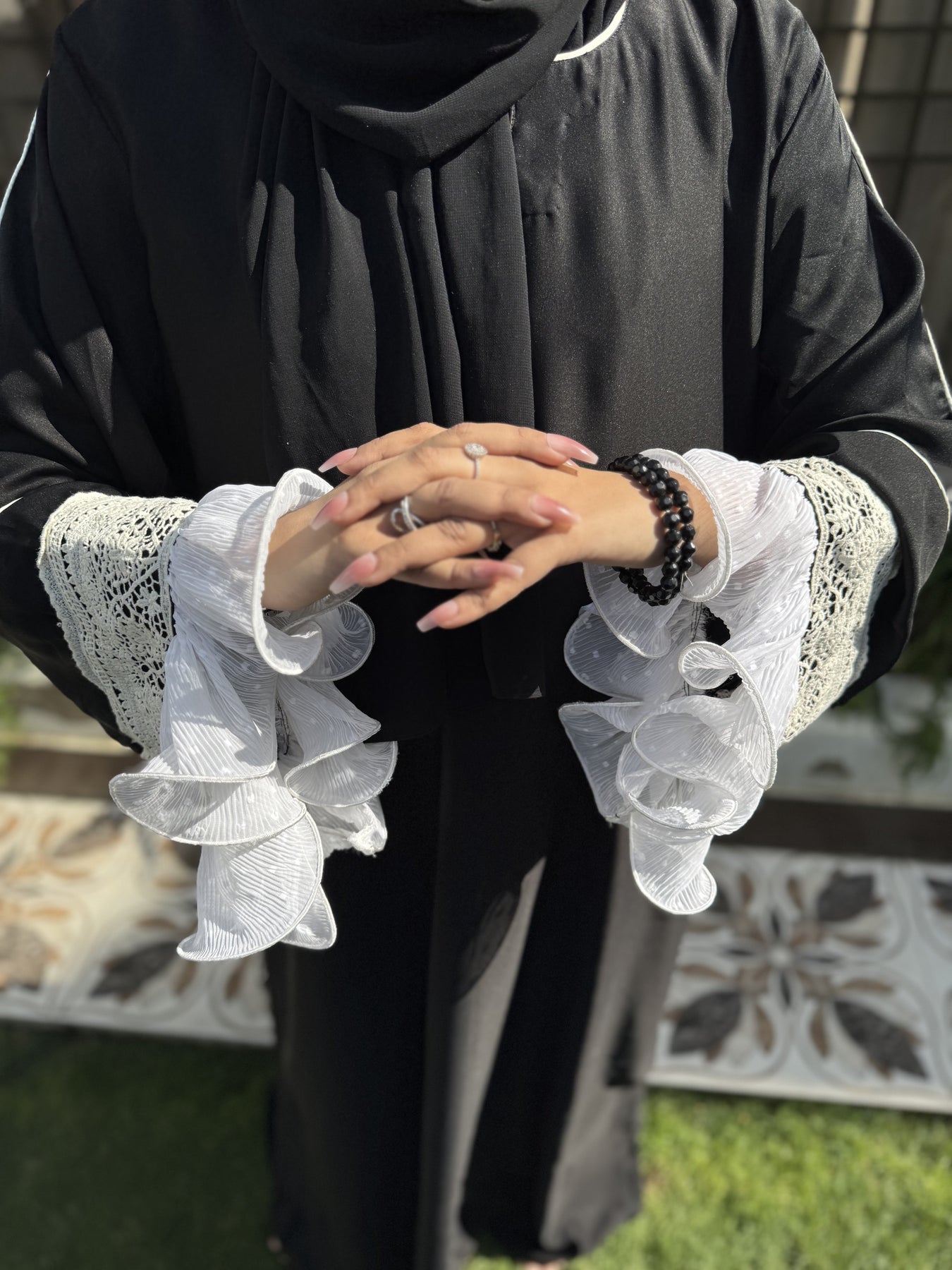 عباية "ميدنايت رافل" مصنوعة من قماش "نادا" الكوري الفاخر باللون الأسود الداكن، وهي مزيج رائع من الأناقة الجريئة والحرفية الدقيقة. تتميز أكمامها المميزة بألواح كروشيه بيضاء متقنة مع كشكشة شيفون متعددة الطبقات، مما يضفي لمسة من الحركة والأنوثة ولمسة من الأناقة على إطلالتكِ المتواضعة. تتضمن هذه المجموعة المكونة من قطعتين حجابًا شيفونًا أسود متناسقًا لإطلالة متكاملة وأنيقة.