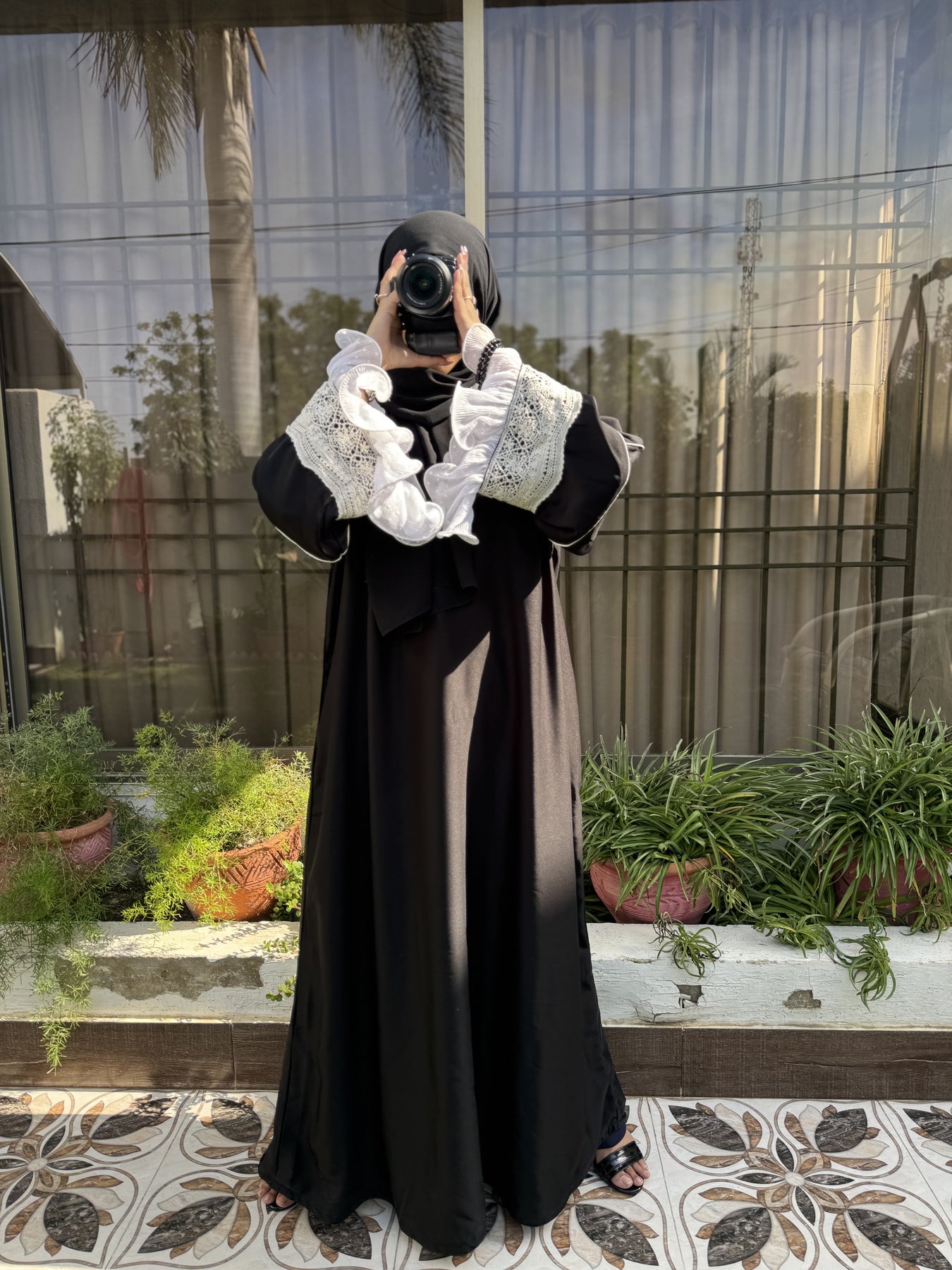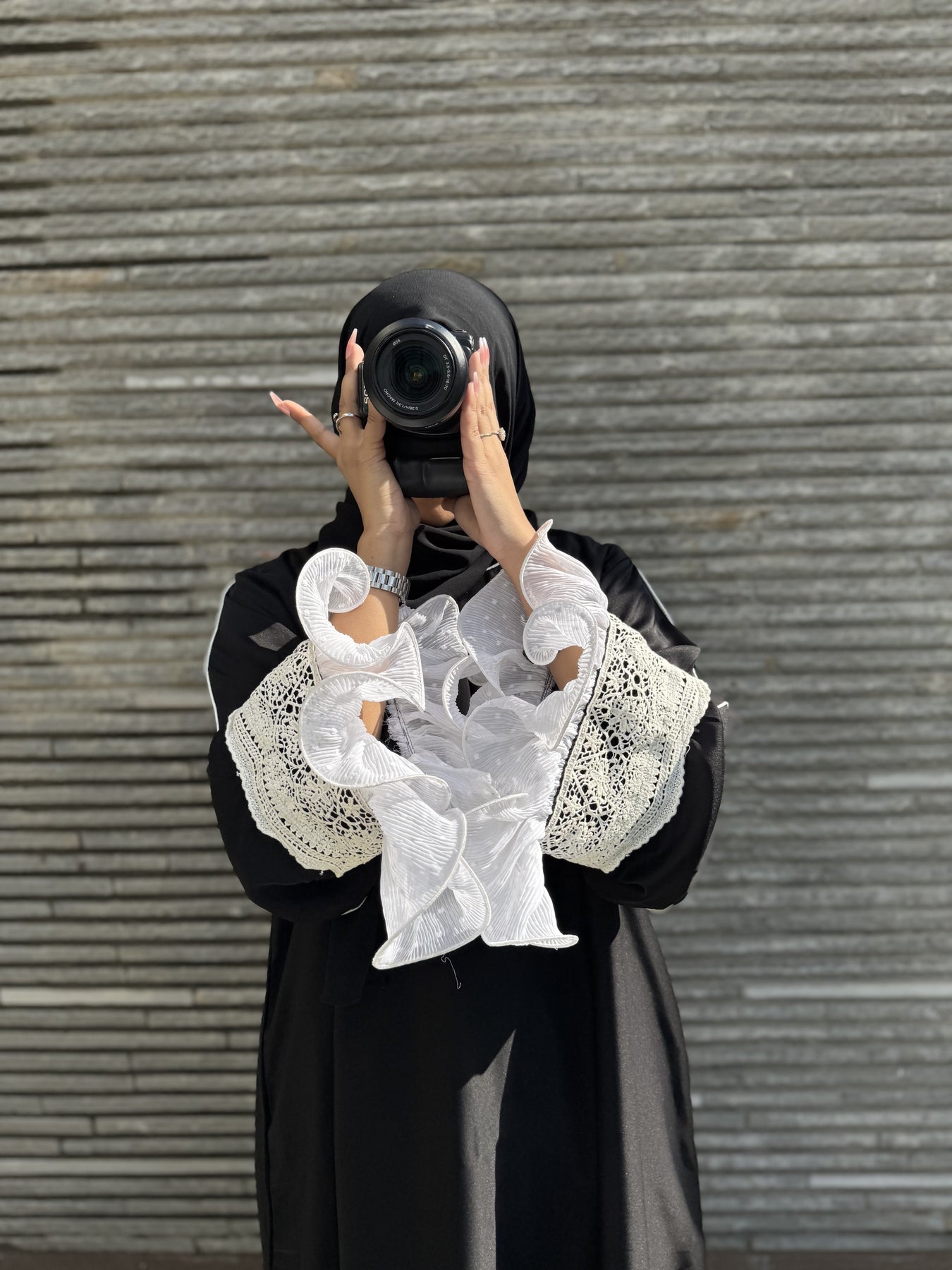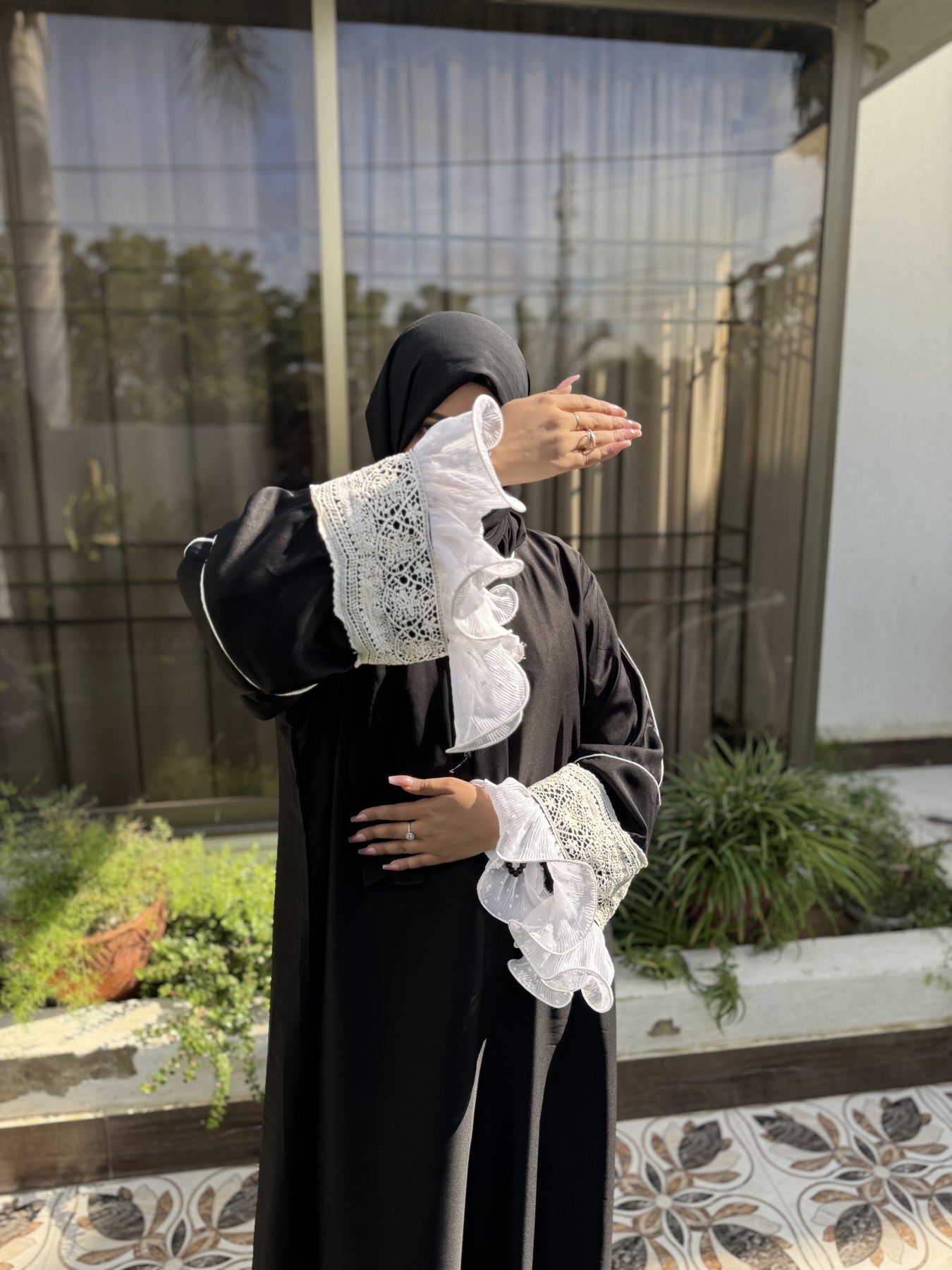 عباية "ميدنايت رافل" مصنوعة من قماش "نادا" الكوري الفاخر باللون الأسود الداكن، وهي مزيج رائع من الأناقة الجريئة والحرفية الدقيقة. تتميز أكمامها المميزة بألواح كروشيه بيضاء متقنة مع كشكشة شيفون متعددة الطبقات، مما يضفي لمسة من الحركة والأنوثة ولمسة من الأناقة على إطلالتكِ المتواضعة. تتضمن هذه المجموعة المكونة من قطعتين حجابًا شيفونًا أسود متناسقًا لإطلالة متكاملة وأنيقة.