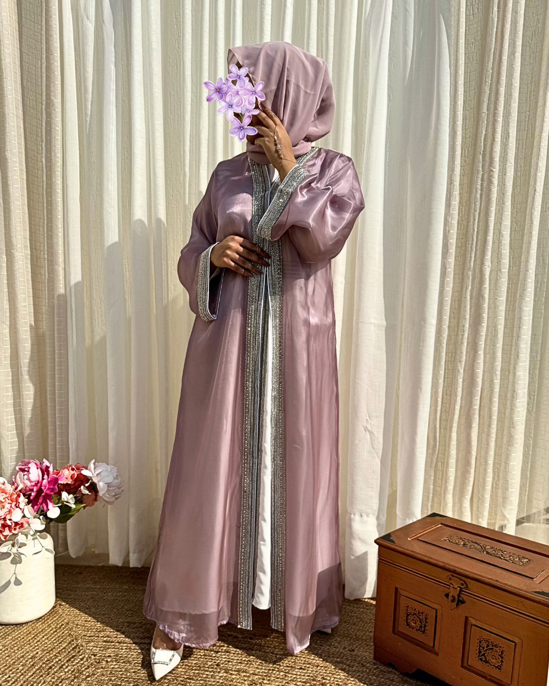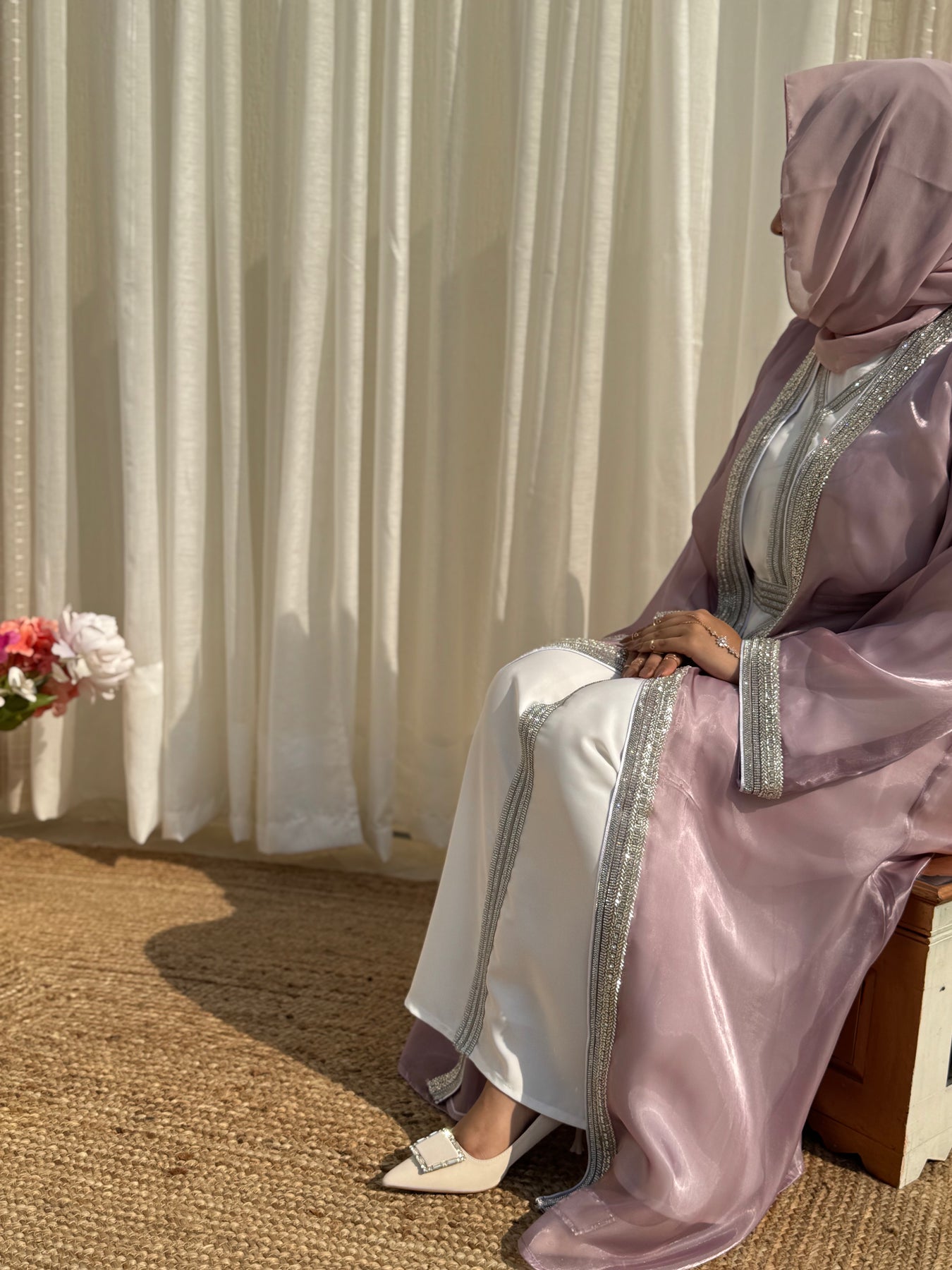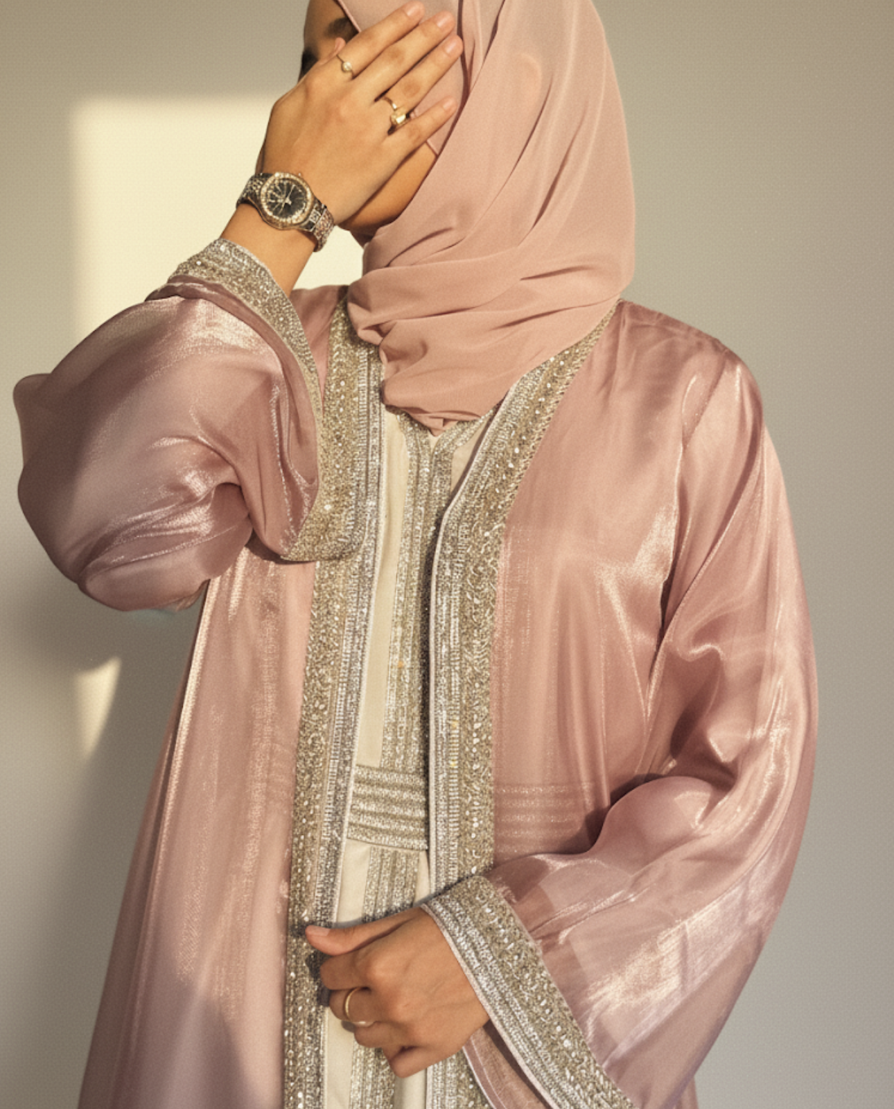 تتألق هذه المجموعة المكونة من أربع قطع بأناقة خالدة مع كل بريق، وتتميز بعباءة خارجية من الأورجانزا مزينة بالكريستال، وبطانة داخلية متناسقة، وحزام مزخرف، وحجاب شيفون ناعم. صُممت لتلفت الأنظار دون عناء - إنها براقة، لكنها في الوقت نفسه ساحرة.