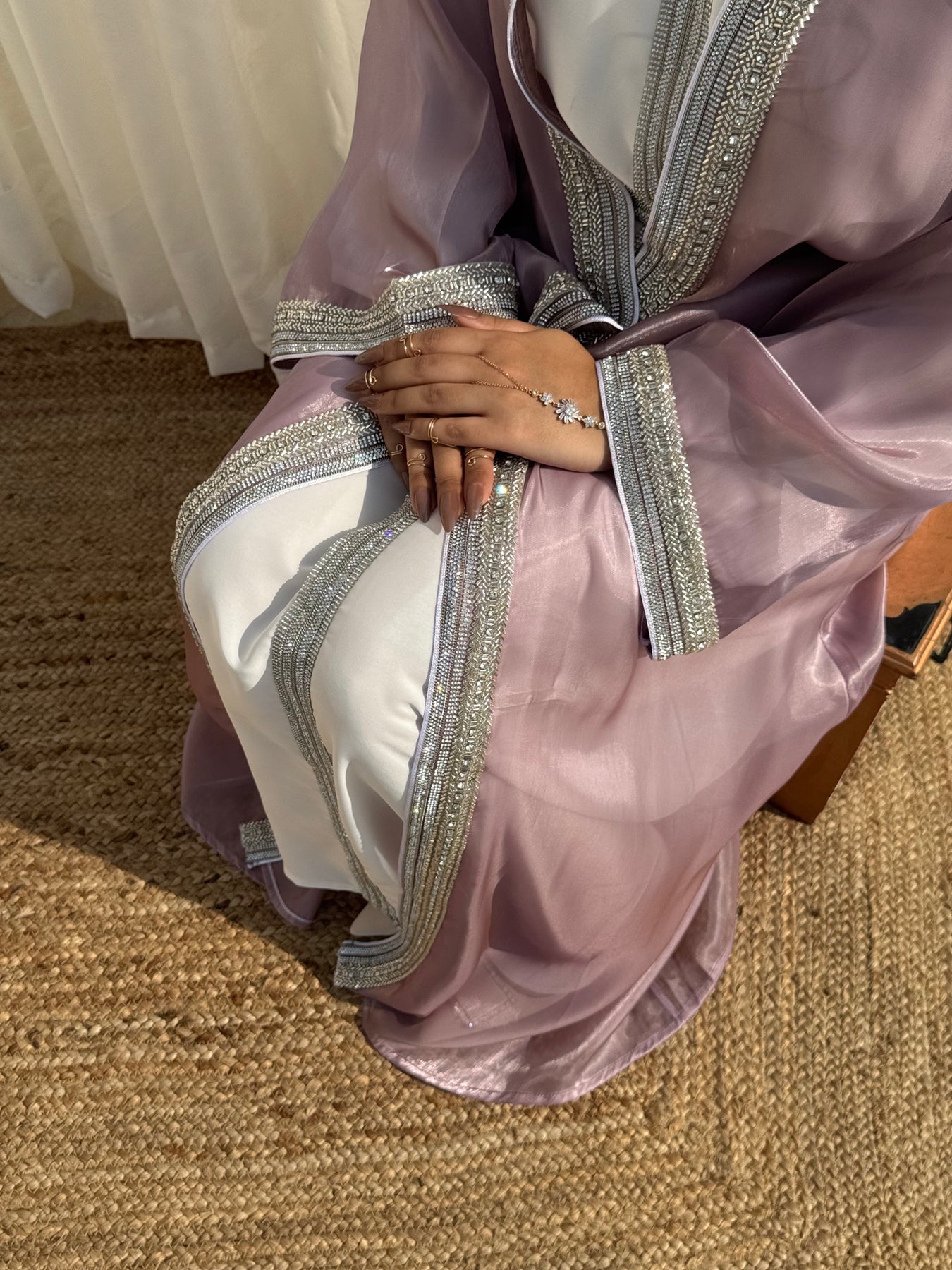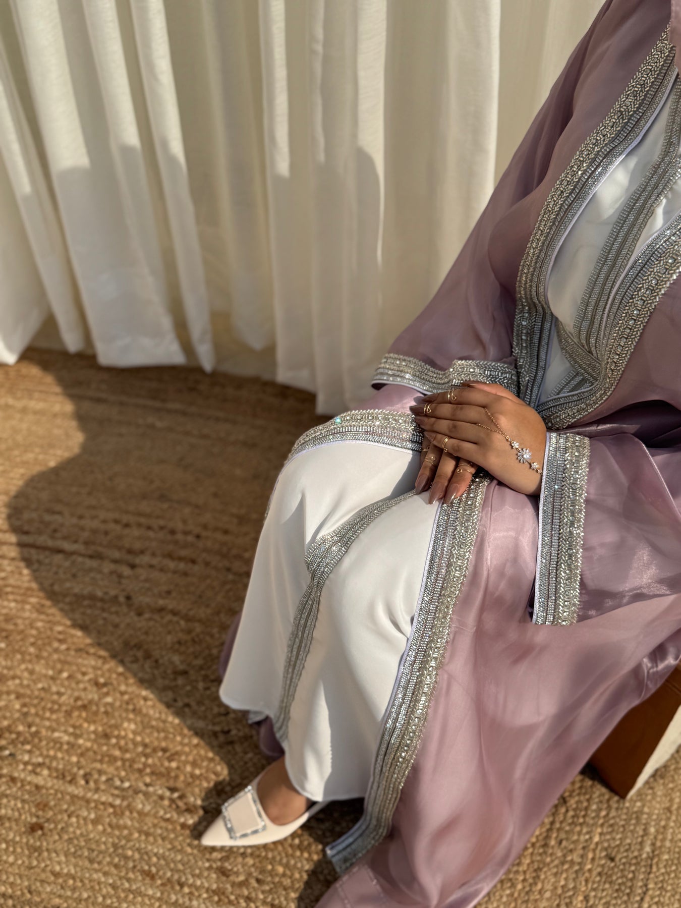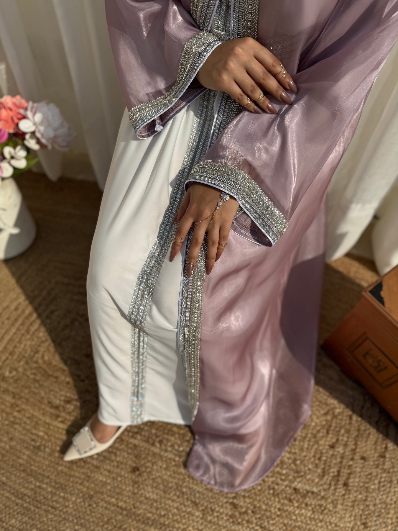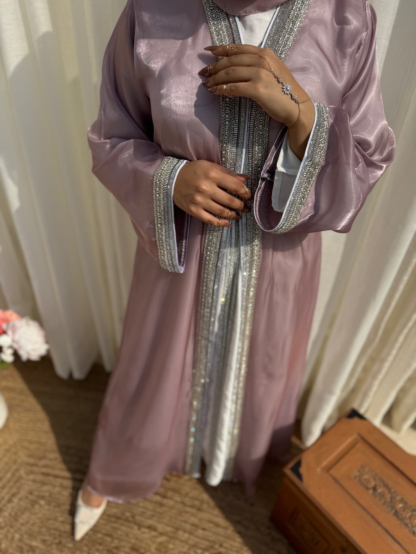 تتألق هذه المجموعة المكونة من أربع قطع بأناقة خالدة مع كل بريق، وتتميز بعباءة خارجية من الأورجانزا مزينة بالكريستال، وبطانة داخلية متناسقة، وحزام مزخرف، وحجاب شيفون ناعم. صُممت لتلفت الأنظار دون عناء - إنها براقة، لكنها في الوقت نفسه ساحرة.