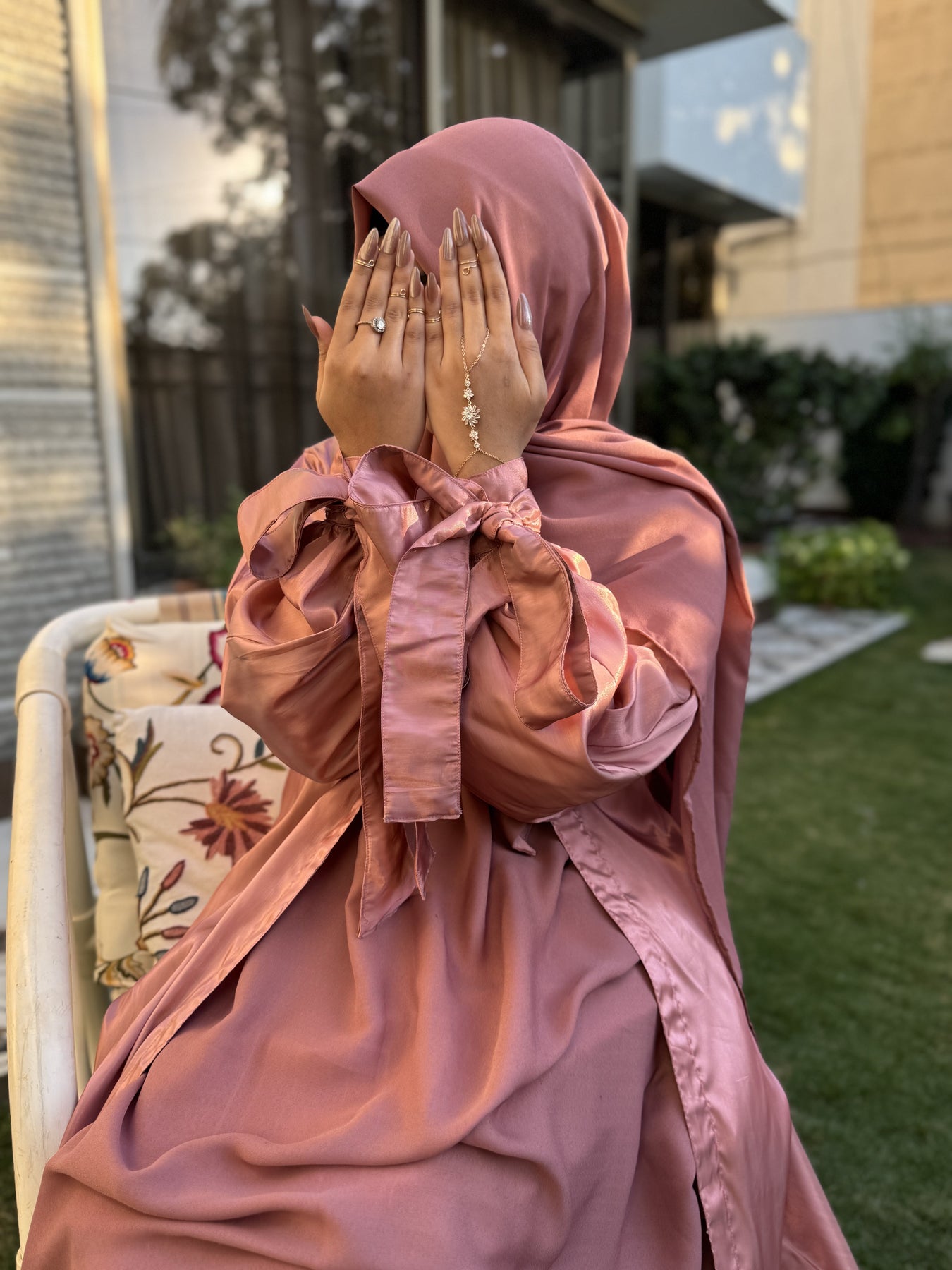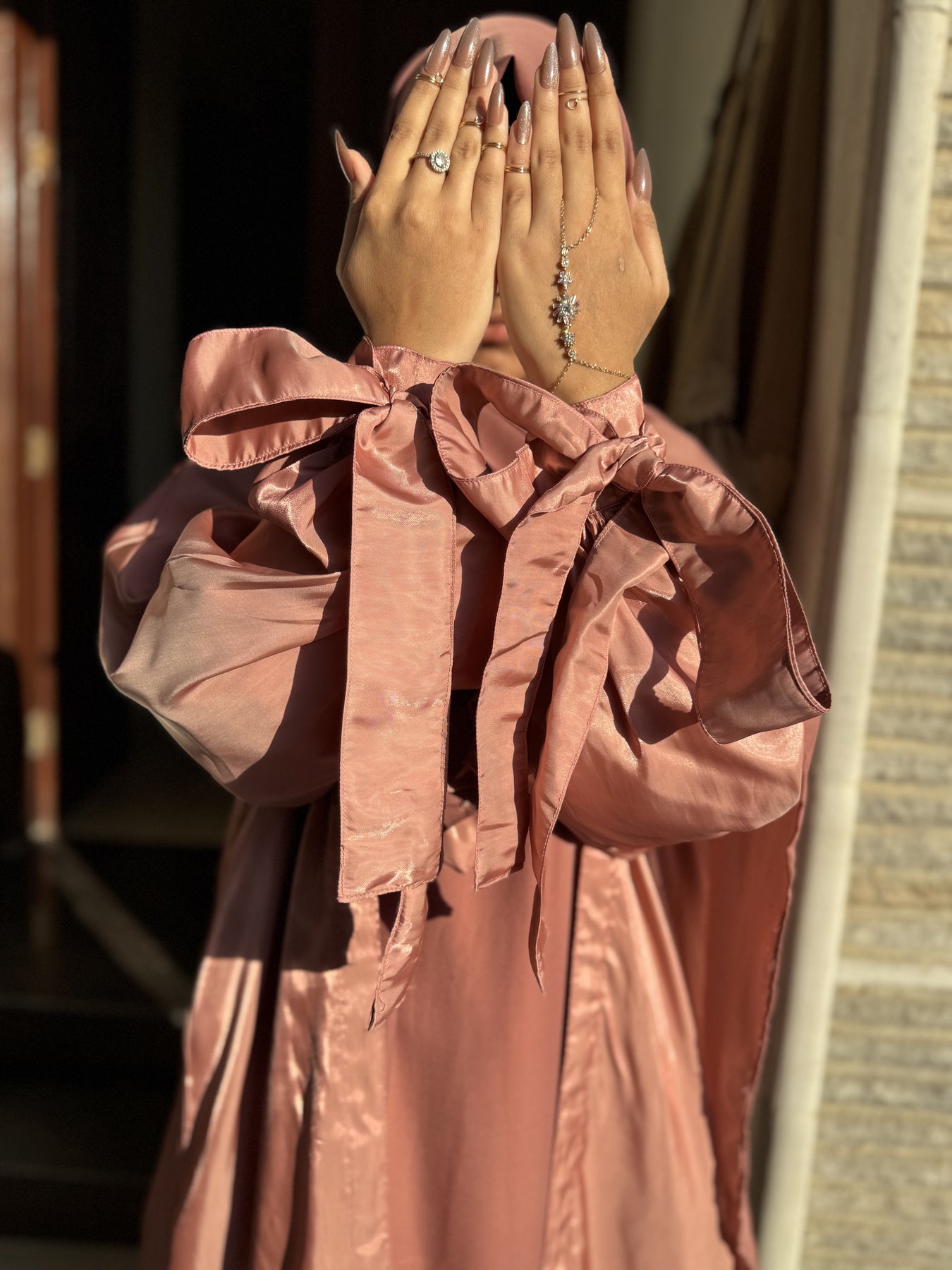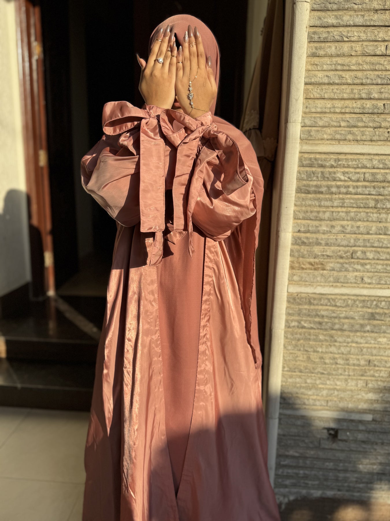 مصنوعة من الحرير الساتان الوردي الفاخر، تتضمن مجموعة العباءة الفاخرة المكونة من 3 قطع حجابًا شيفونًا ناعمًا للحصول على مظهر أنيق تمامًا.
