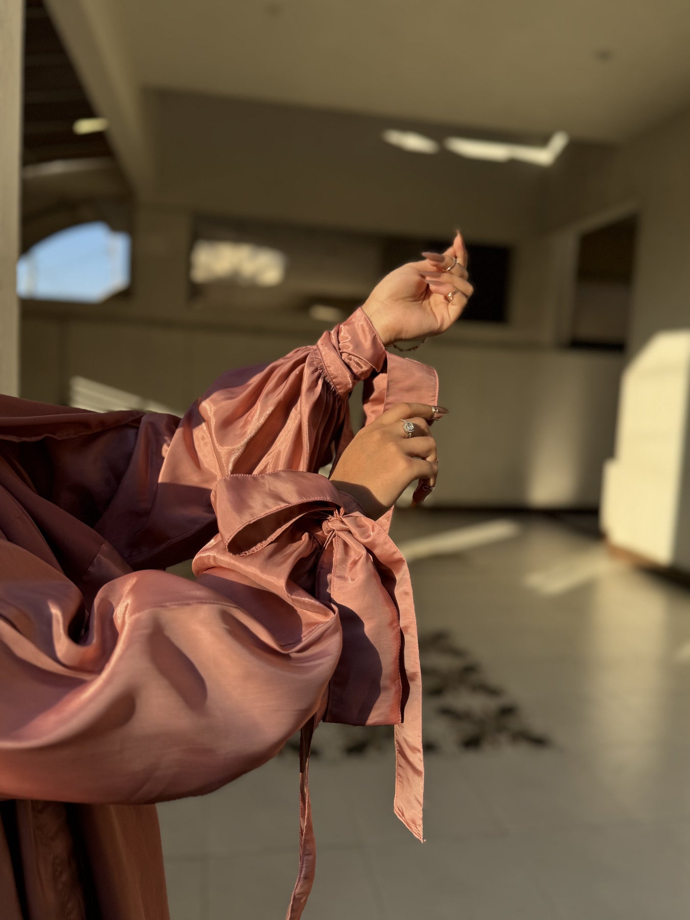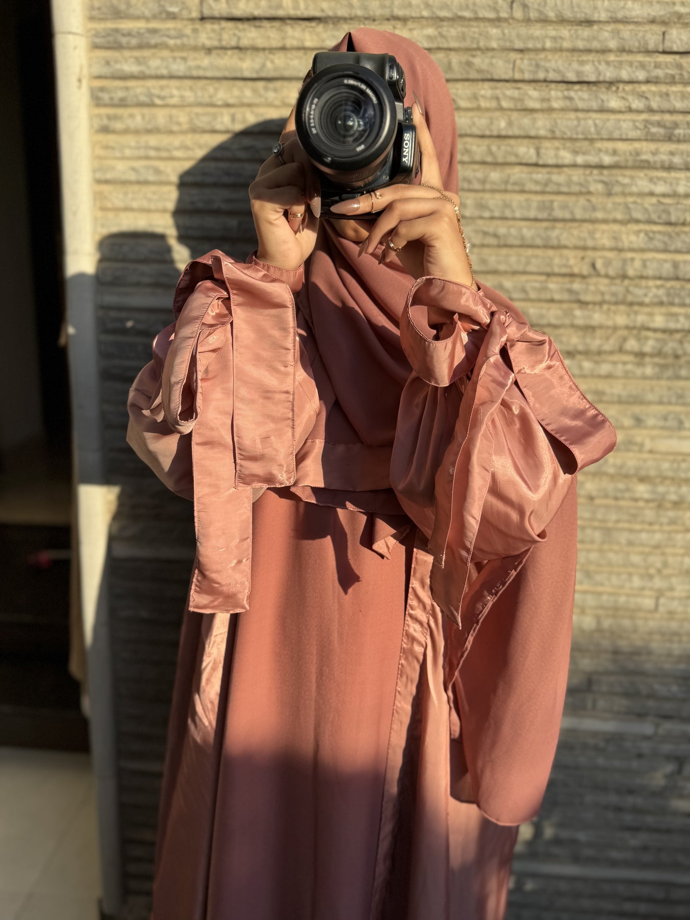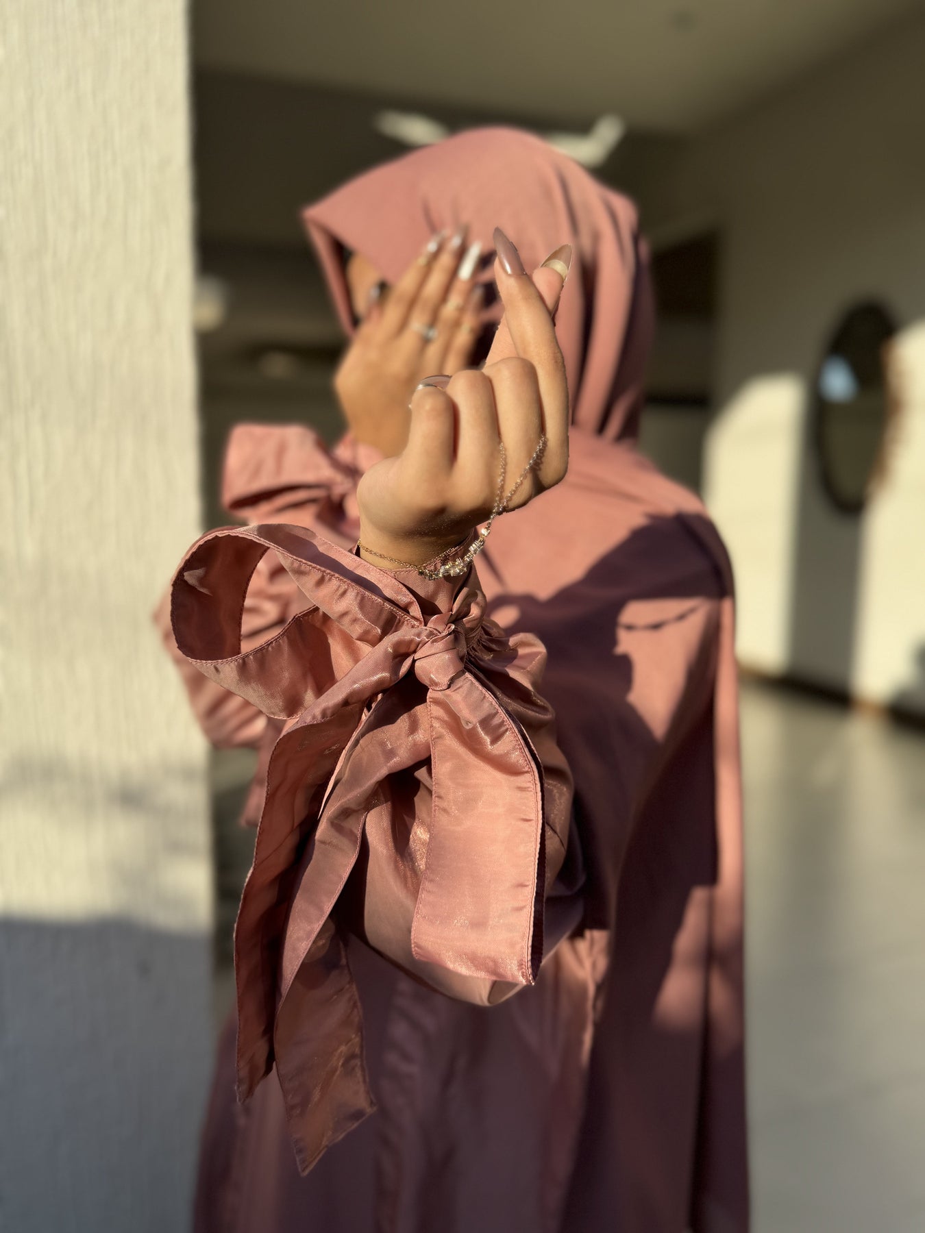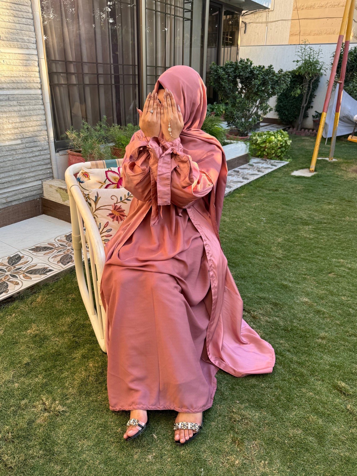 مصنوعة من الحرير الساتان الوردي الفاخر، تتضمن مجموعة العباءة الفاخرة المكونة من 3 قطع حجابًا شيفونًا ناعمًا للحصول على مظهر أنيق تمامًا.