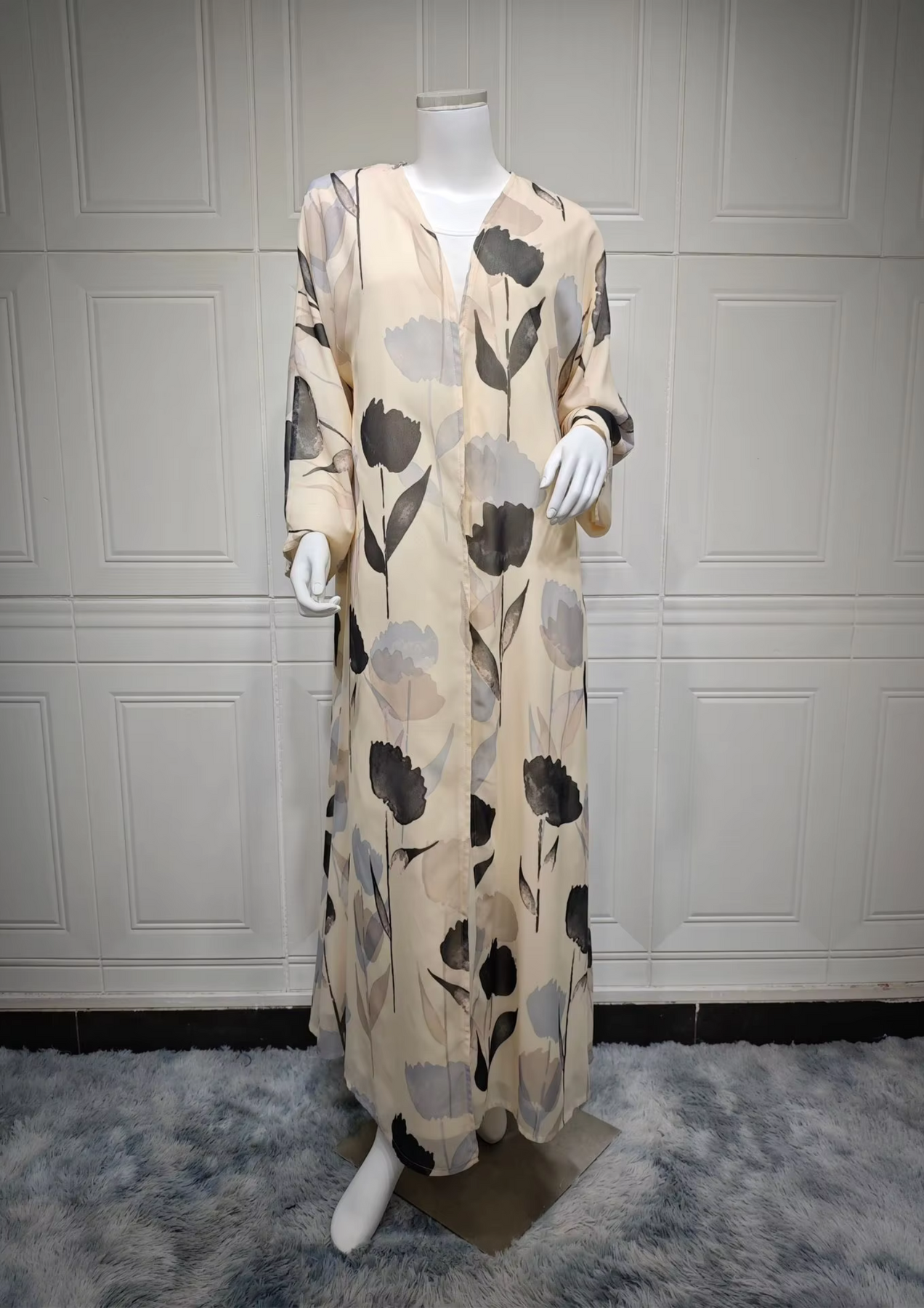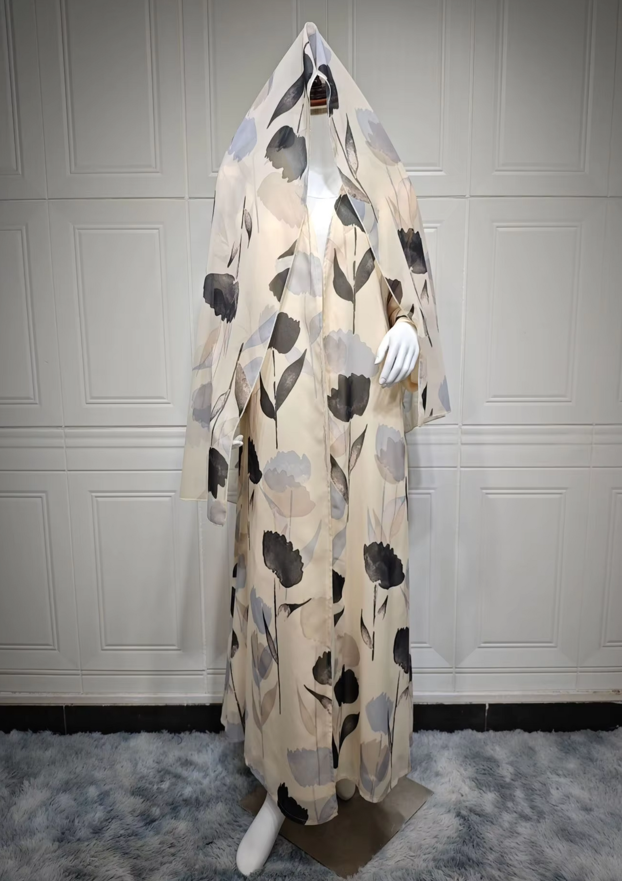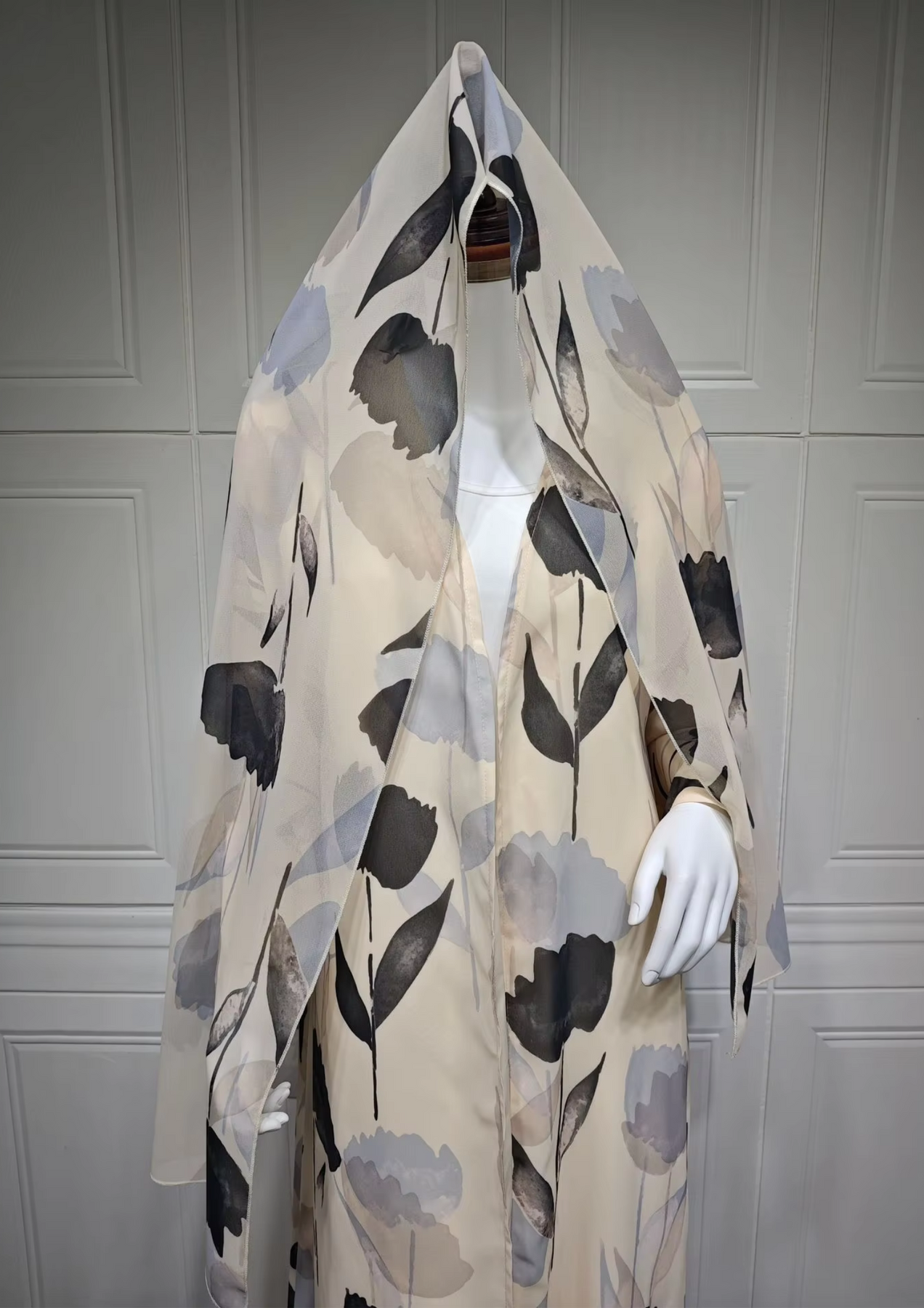 This elegant abaya comes with a matching sheila and features soft neutral tones with subtle patterns. Made from lightweight chiffon, it’s comfortable to wear and easy to style for any occasion.