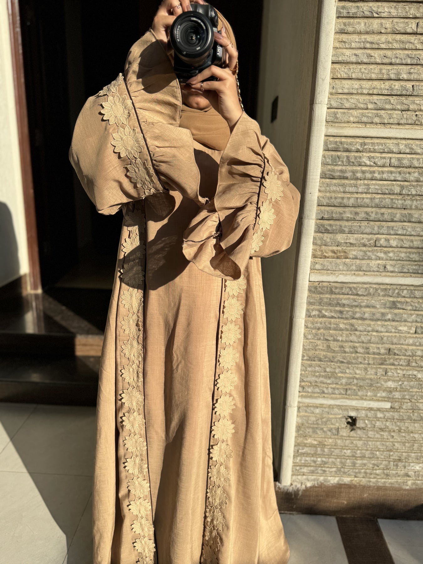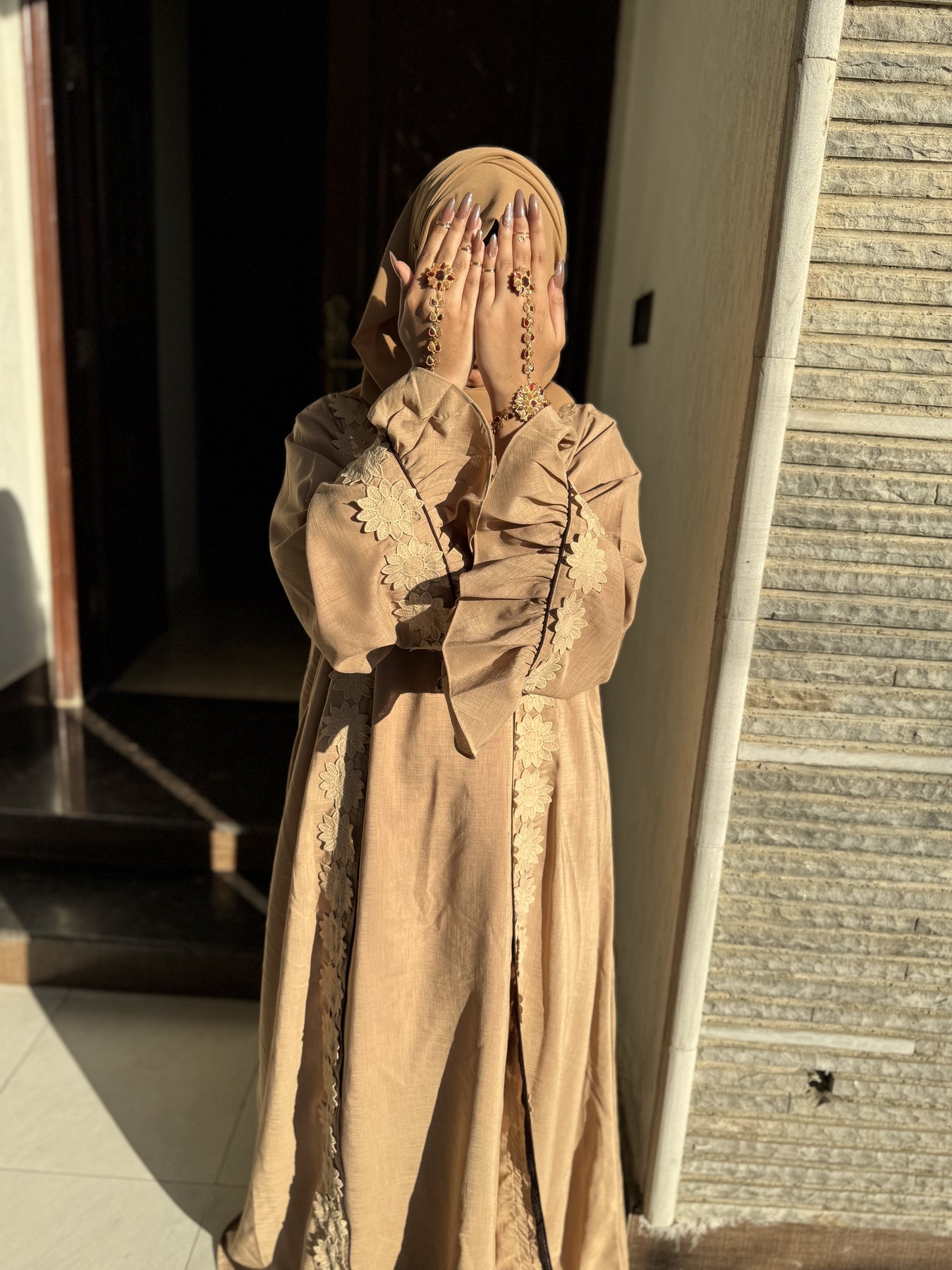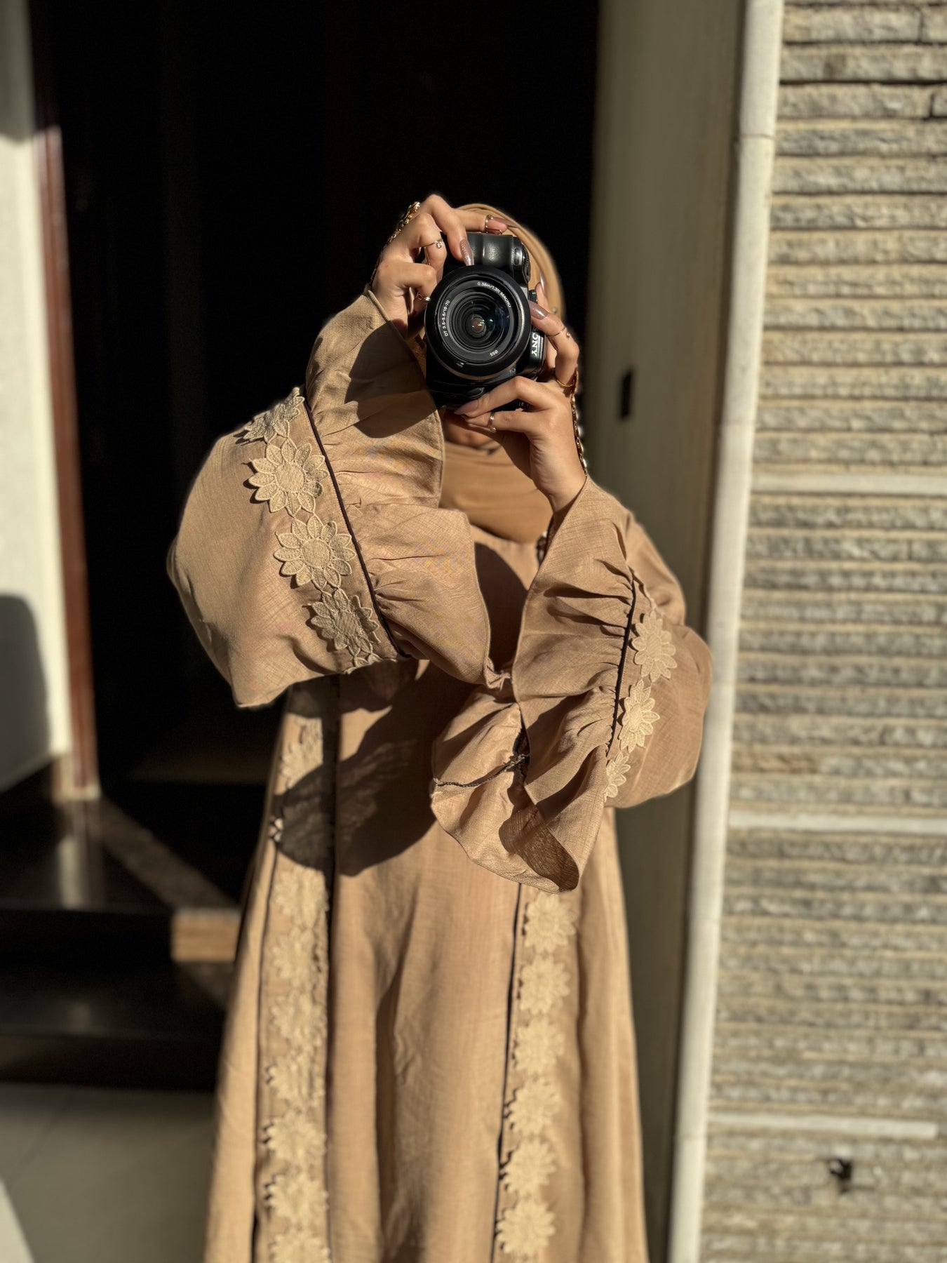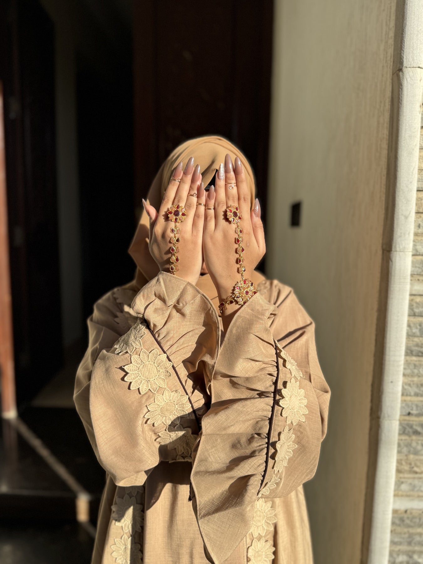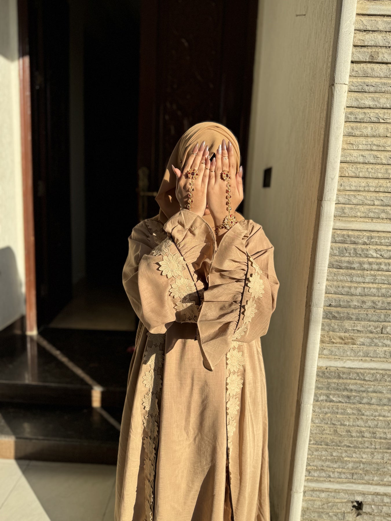 The Amber Sands abaya is a soft yet striking piece, crafted in premium Turkish cotton  with a beautifully textured finish. This 2-piece set comes complete with a matching soft chiffon hijab for an effortlessly graceful appearance.