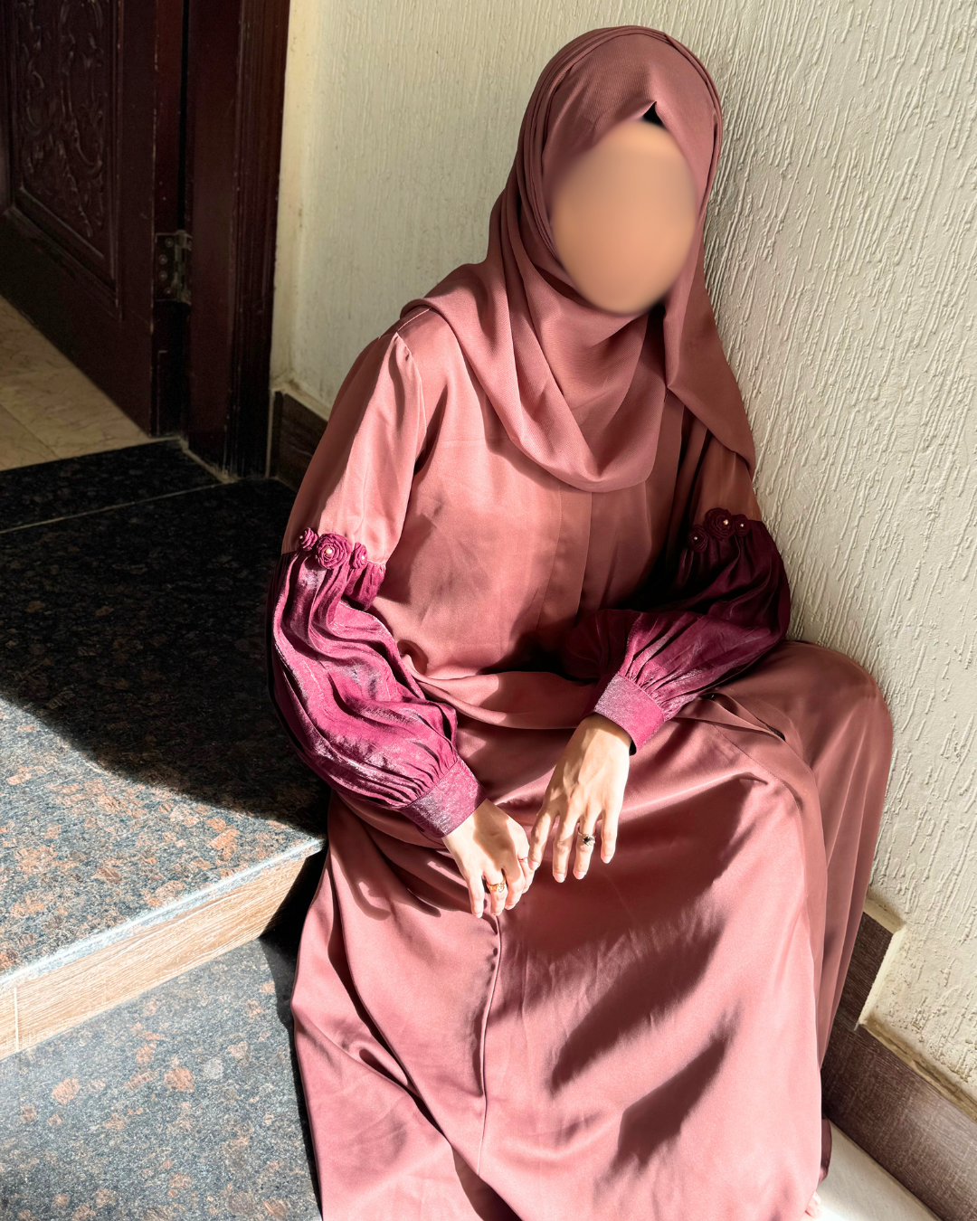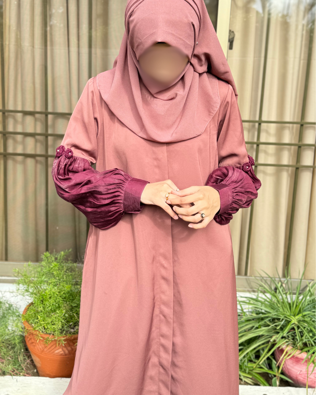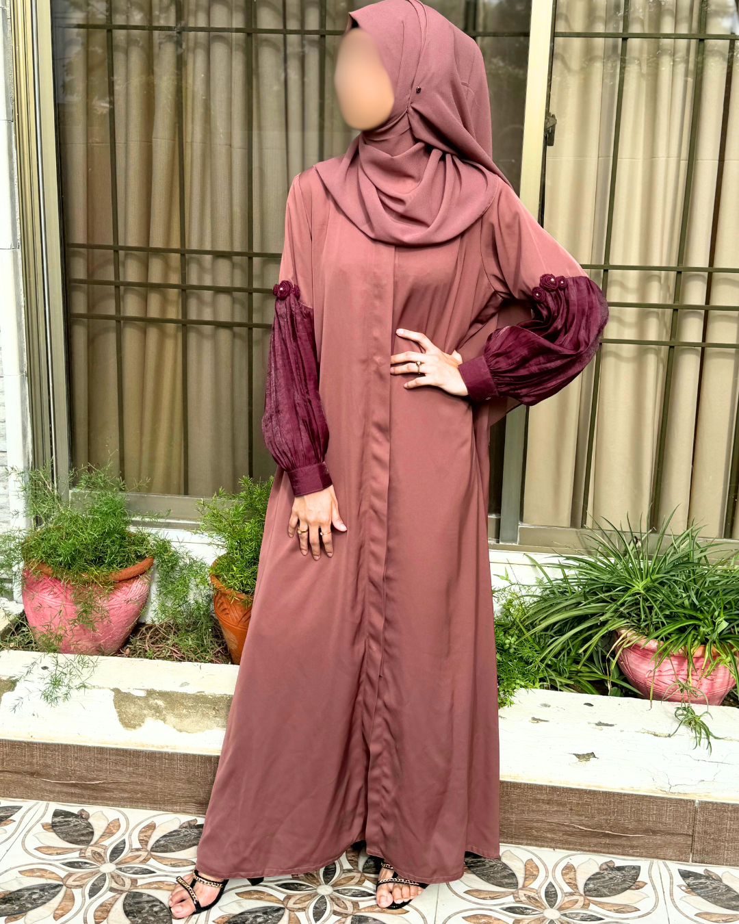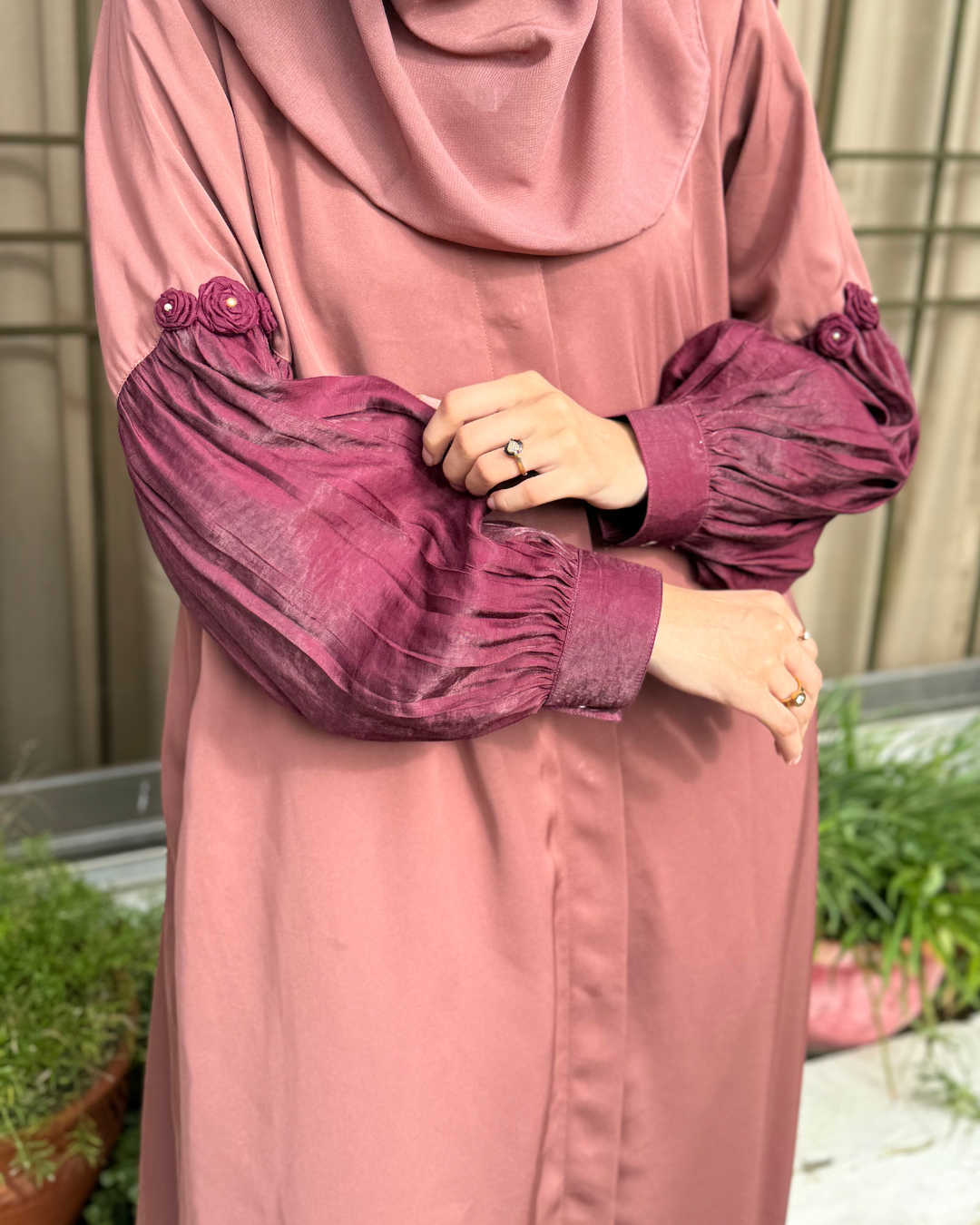 The premium Reem abaya is made in luxury Foil silk fabric and premium imported Nida Fabric. It is a 2-pc luxury abaya with hijab and includes a pocket .