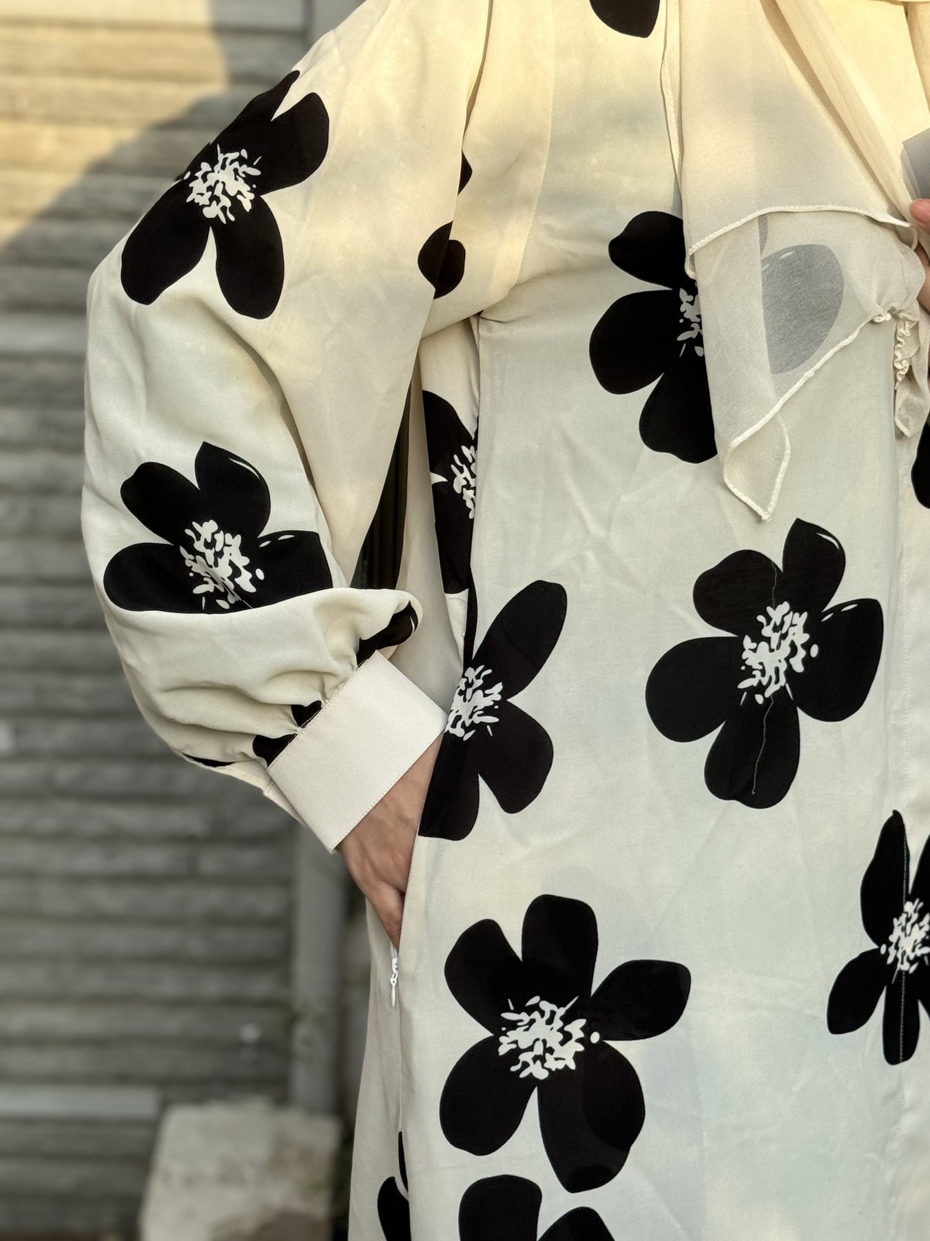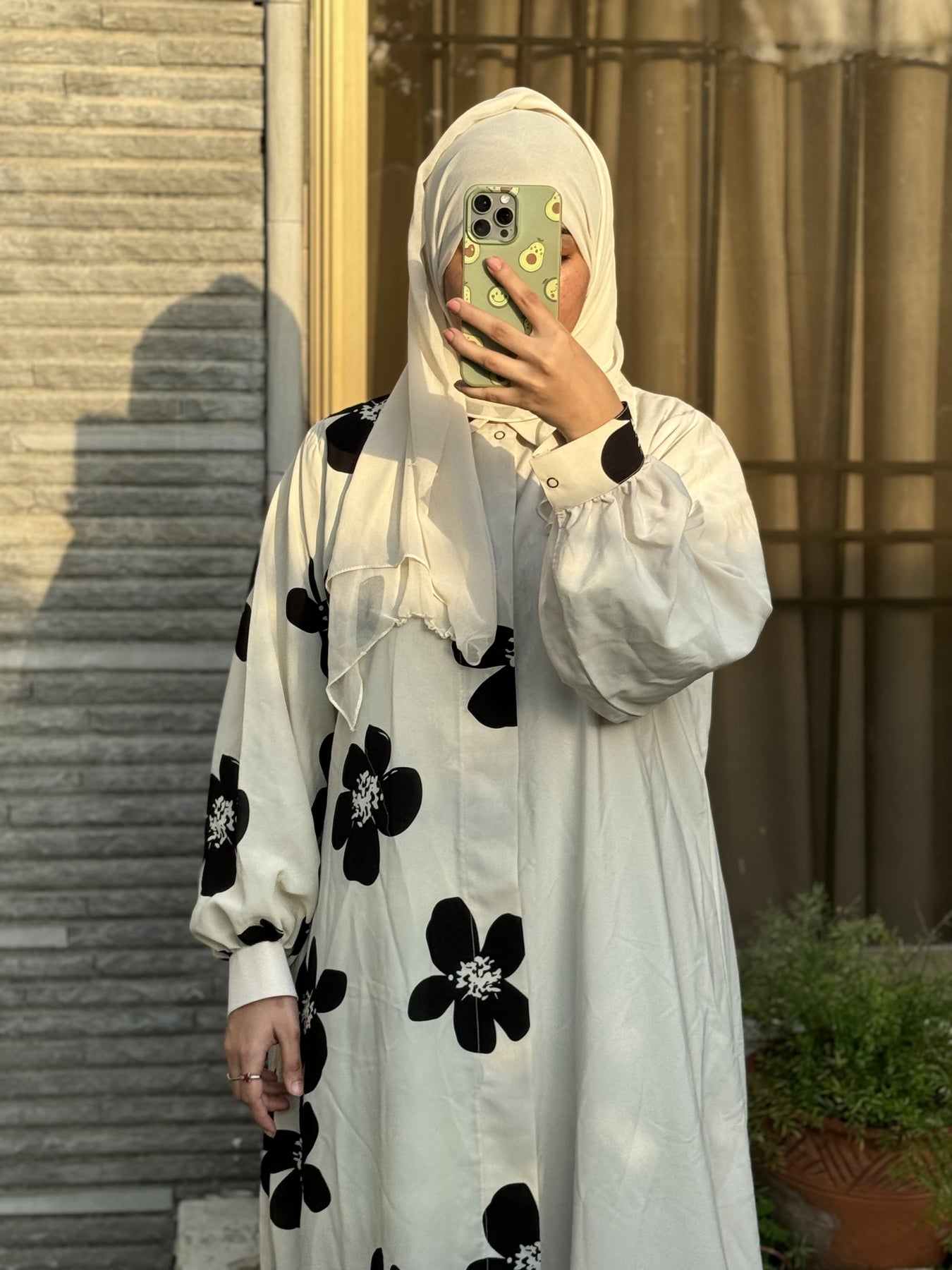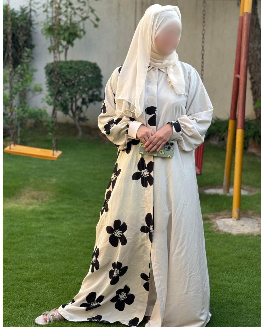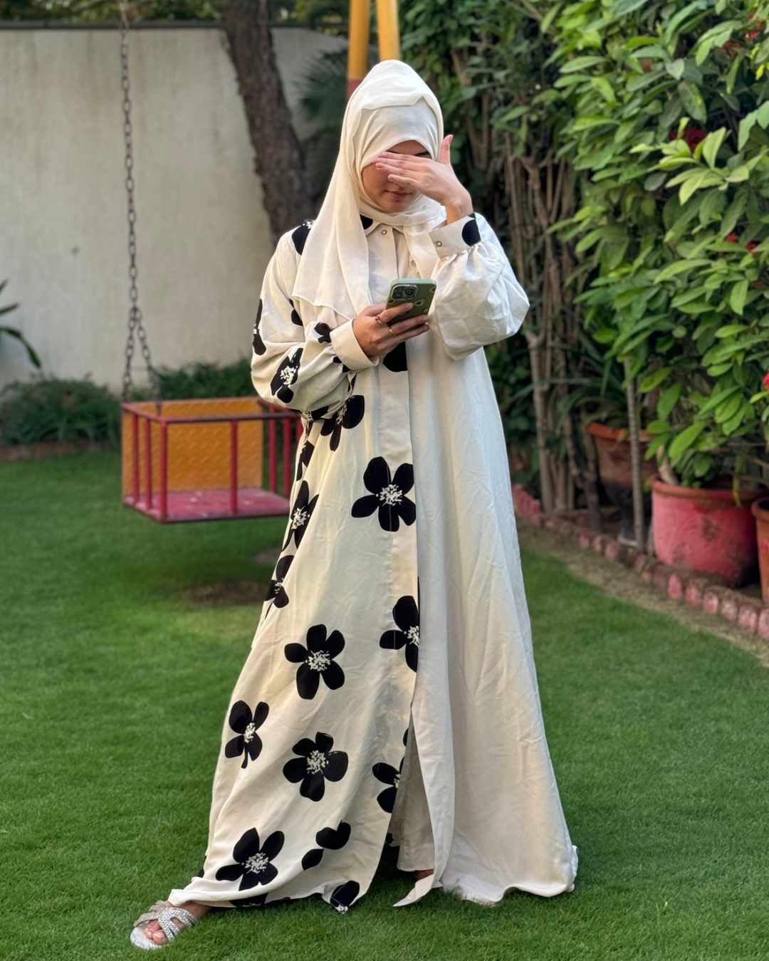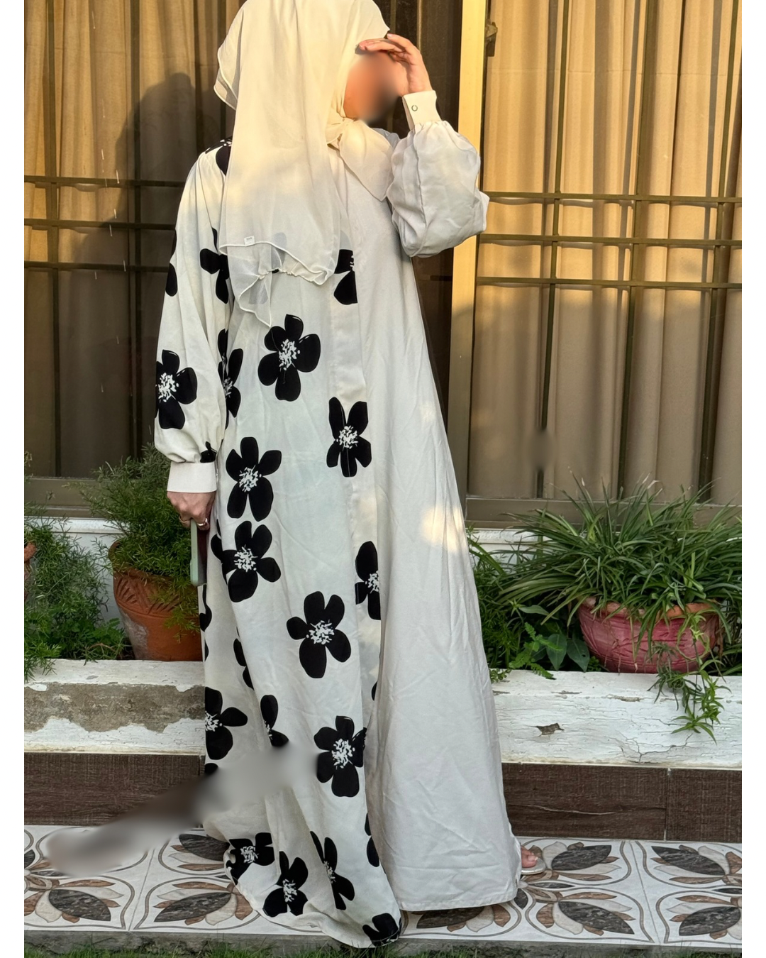 The premium black and white floral abaya is made in luxury beige printed Nida Fabric. It is a 2-pc chic abaya and chiffon hijab.
